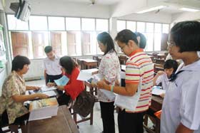 News วันนี้ (12 พฤษภาคม 2555) โรงเรียนได้จัดดำเนินการรับมอบตัวนักเรียนใหม่ ชั้น ม.1 ซึ่งมีปัญหาขลุกขลักเรื่องใบมอบตัวจากระบบเล็กน้อย แต่ที่สุดก็สามารถแก้ปัญหาจนผ่านพ้นไปด้วยดี บรรยากาศในภาพรวมของการรับมอบตัวเป็นไปด้วยความเรียบร้อย จะมีปัญหาเกี่ยวกับนักเรียนสำรองที่ถูกเรียกรายงานตัวจะยังไม่มีชื่อในระบบฐานข้อมูล จึงยังไม่สามารถกรอกใบมอบตัวได้ ซึ่งกรรมการรับมอบตัวได้เตรียมใบมอบตัวที่เขียนด้วยมือไว้ให้ด้วยแล้ว