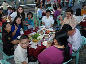 ส่วนอาหารการกินอุดมสมบูรณ์มาก เรียกว่าอิ่มหมีพีมันกันถ้วนหน้า ในระหว่างรับประทานอาหารต่างก็เวียนกันขึ้นไปร้องเพลงขับกล่อมผู้มาร่วมงานกันครึกครื้น